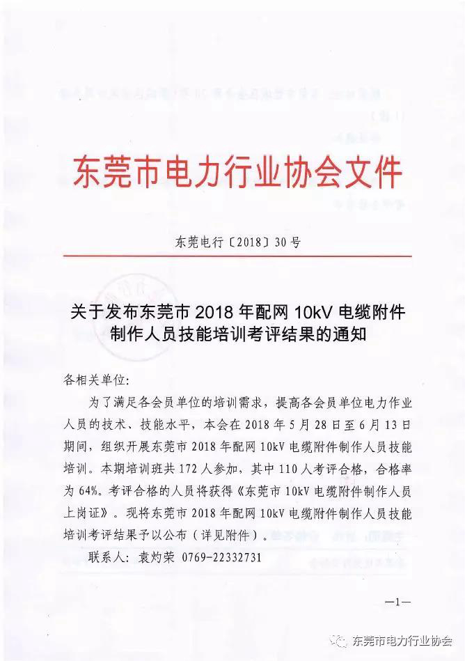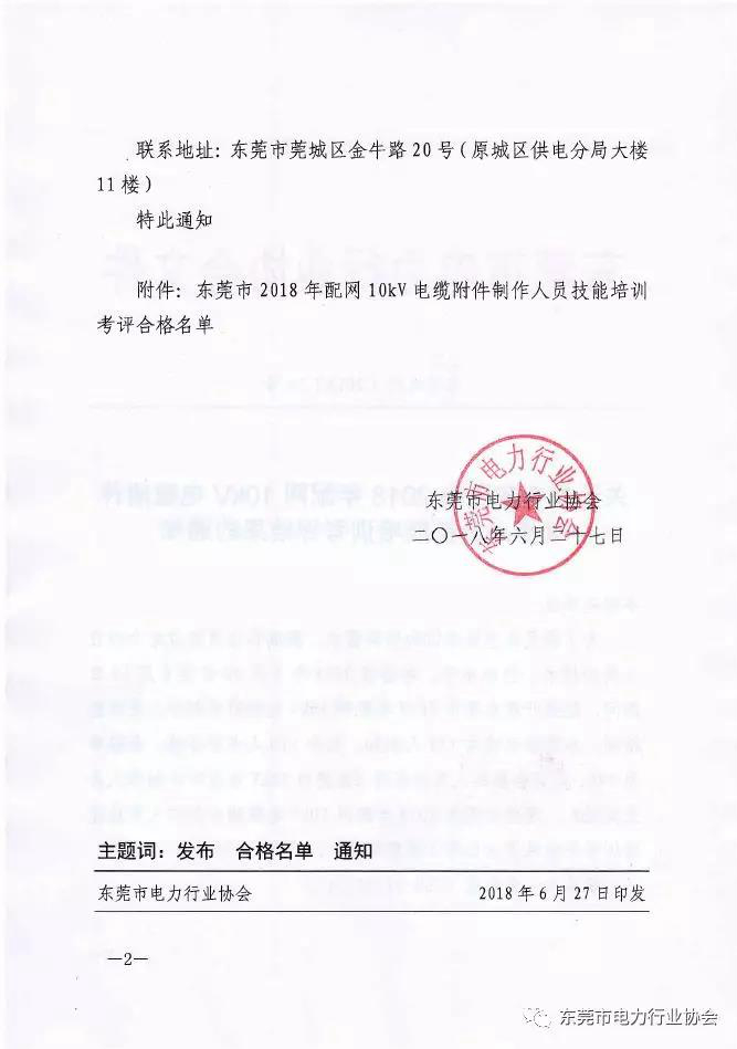 為了提高我司電力作業(yè)人員的技術(shù)、技能水平,我司指派陶工、楊工參加?xùn)|莞市電力行業(yè)協(xié)會(huì)組織的東莞市2018年配網(wǎng)10kV電纜附件制作人員技能培訓(xùn)。