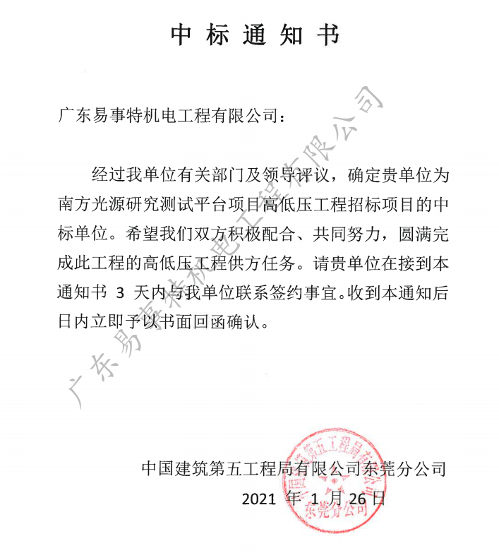 2021年1月26日,我司憑借豐富的施工經(jīng)驗、雄厚的技術(shù)力量和良好的信譽(yù)成功中標(biāo)南方光源研究測試平臺項目高低壓工程。